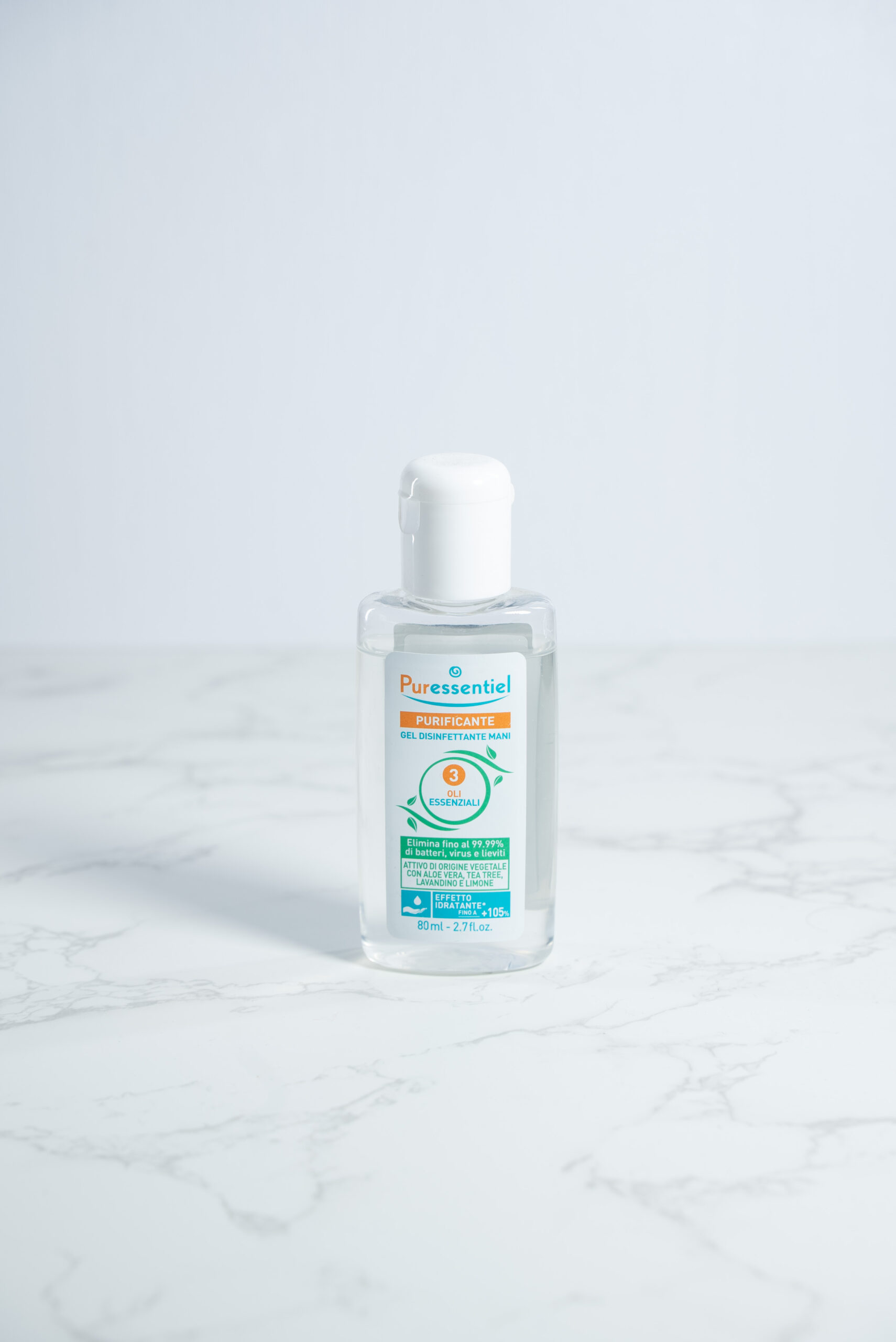 Puressentiel Purificante Gel Disinfettante Mani 3 Oli Essenziali Elimina fino al 99.99% di batteri, virus e lieviti. Disinfezione rapida delle mani senza acqua, senza sapone, senza risciacquo. Non secca le mani. Principio attivo vegetale: 71.9% di alcool vegetale non denaturato da ftalati. 3 oli essenziali (Limone, Lavandino Grosso, Tea Tree). Con Aloe vera addolcente. Effetto idratante immediato: fino a 105% di idratazione in più*. Tripla efficacia: anti-batterica¹, anti-virale² e levuricida³. Efficace su batteri, lieviti e virus. Presidio medico chirurgico reg. n. 20581 del Ministero della Salute *Test strumentale a 1 or a dopo l’applicazione – Media su 4 soggetti. Media su 10 soggetti: 71% di idratazione in più. Modo d’uso: Sfregare le mani con una noce di gel (3 ml) per 1 minuto. Azione immediata. Si utilizza su mani pulite. 80 ml